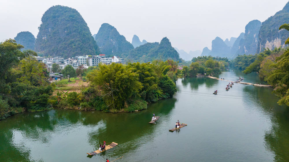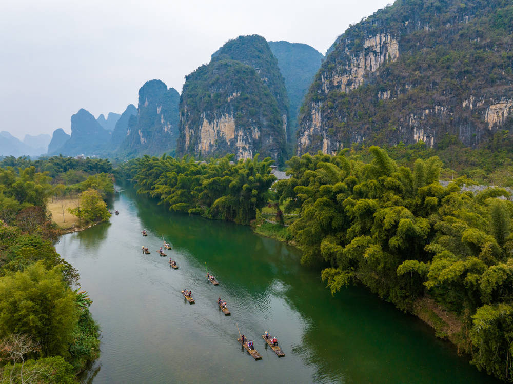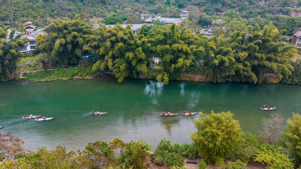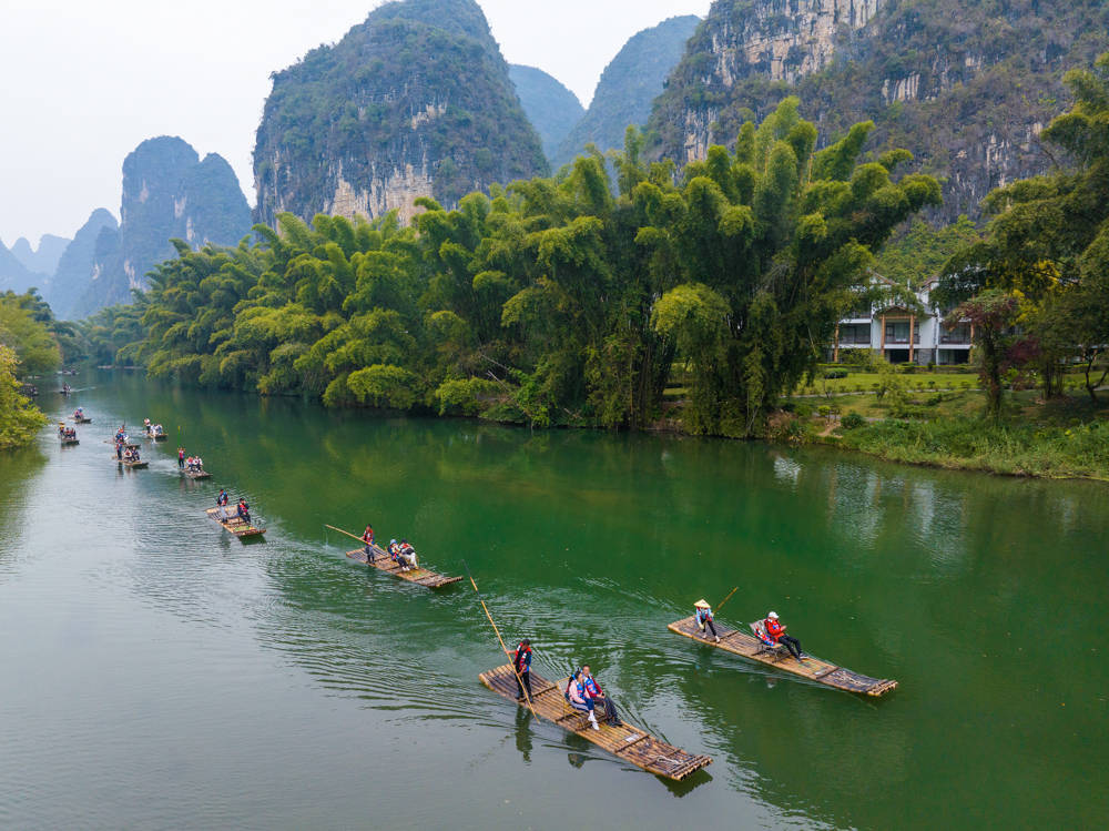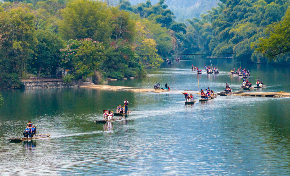 冬日时节,广西桂林市阳朔县遇龙河景区峰峦叠翠,碧水周折,奼紫嫣红的景致招引旅客赏景游玩。