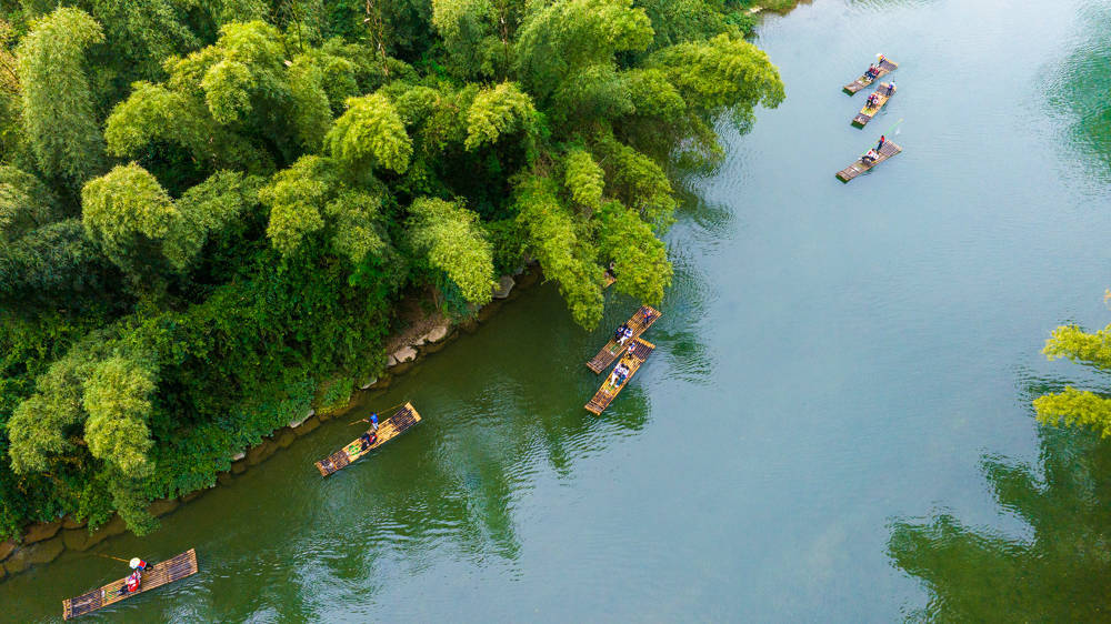 以上图片:2025年12月10日,旅客乘坐竹筏在广西桂林市阳朔县遇龙河赏景游玩。(无东说念主机相片)CICPHOTO/何汉文 摄